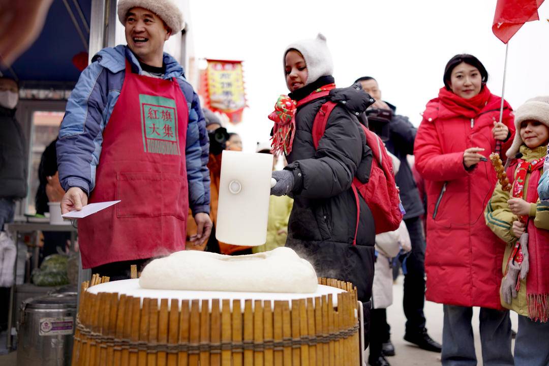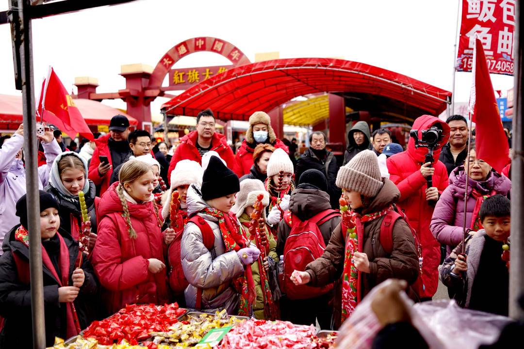 Одетые в теплую зимнюю одежду и красные шарфы, российские дети прогуливались по рынку, наблюдая за рисованием сахарной глазурью и пробуя свои силы в толчении рисовых лепешек, проявляя большой интерес к местным деликатесам. Громкие мелодии северо-восточных барабанов и обилие китайского красного цвета позволили российским детям воочию ощутить очарование обычаев китайского Нового года.