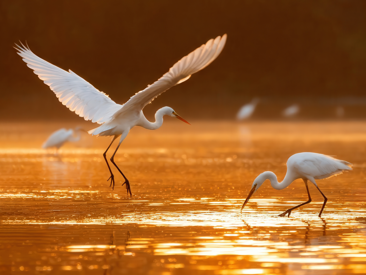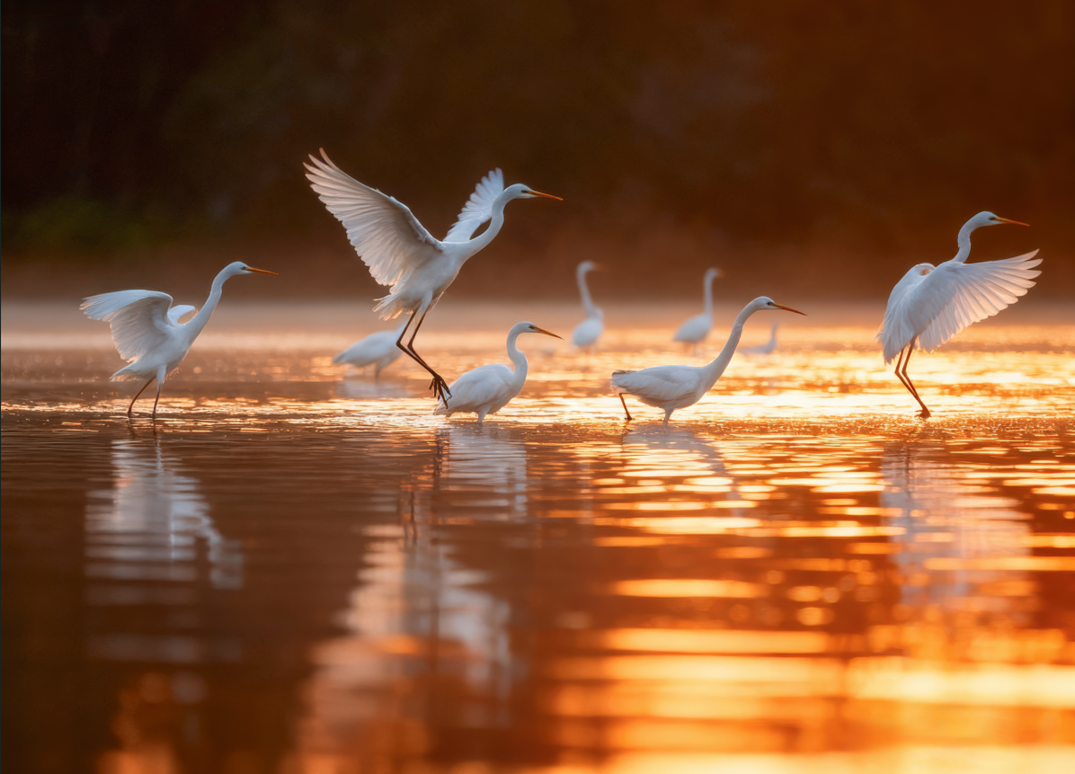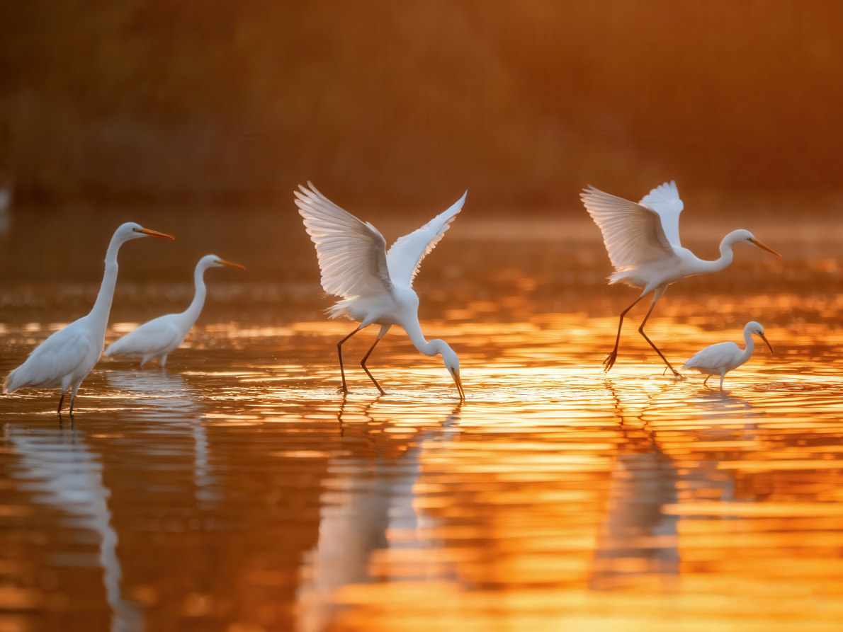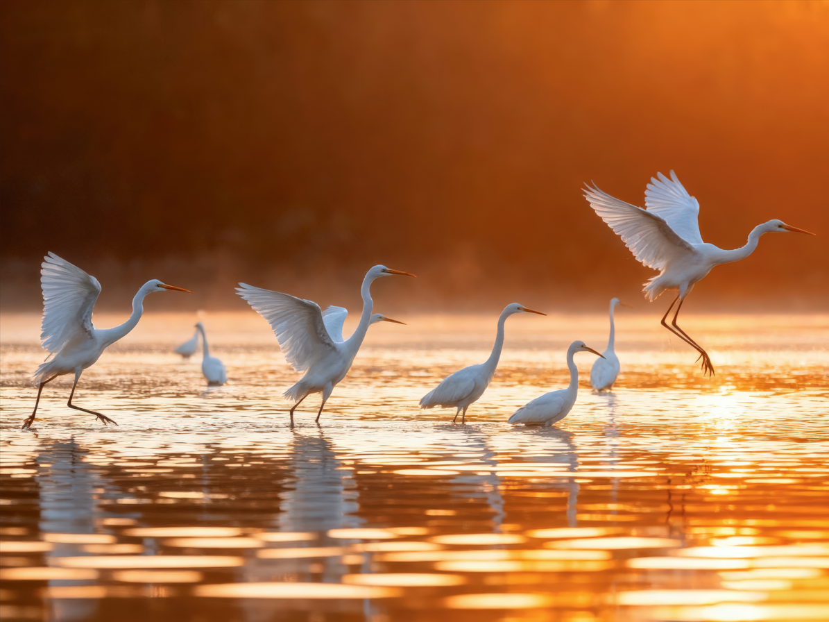 Когда первые лучи рассвета пробиваются сквозь темноту, набережная города Цзиньчжоу в провинции Ляонин напоминает потрясающую картину-свиток. Цапли либо грациозно стоят, либо расправляют крылья, чтобы взлететь; их белоснежные перья блестят в золотистом сиянии утреннего солнца. Их ловкие и живые фигуры придают безграничную жизненную силу этому мирному рассвету, полностью раскрывая очарование природы.
