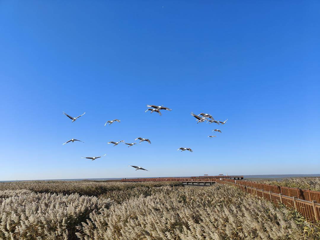 В болотистой местности устья реки Ляохэ золотистые волны переливаются насквозь . Красноклювые журавли добавляют очарования и красоты этому месту, создавая потрясающую природную картину.