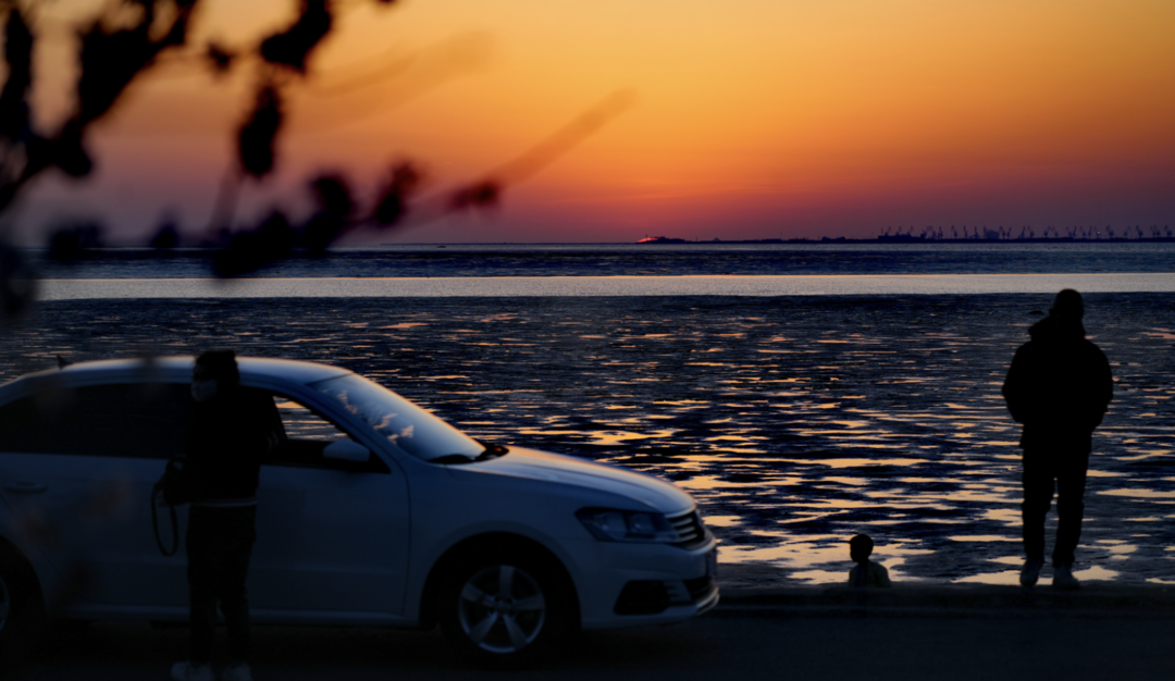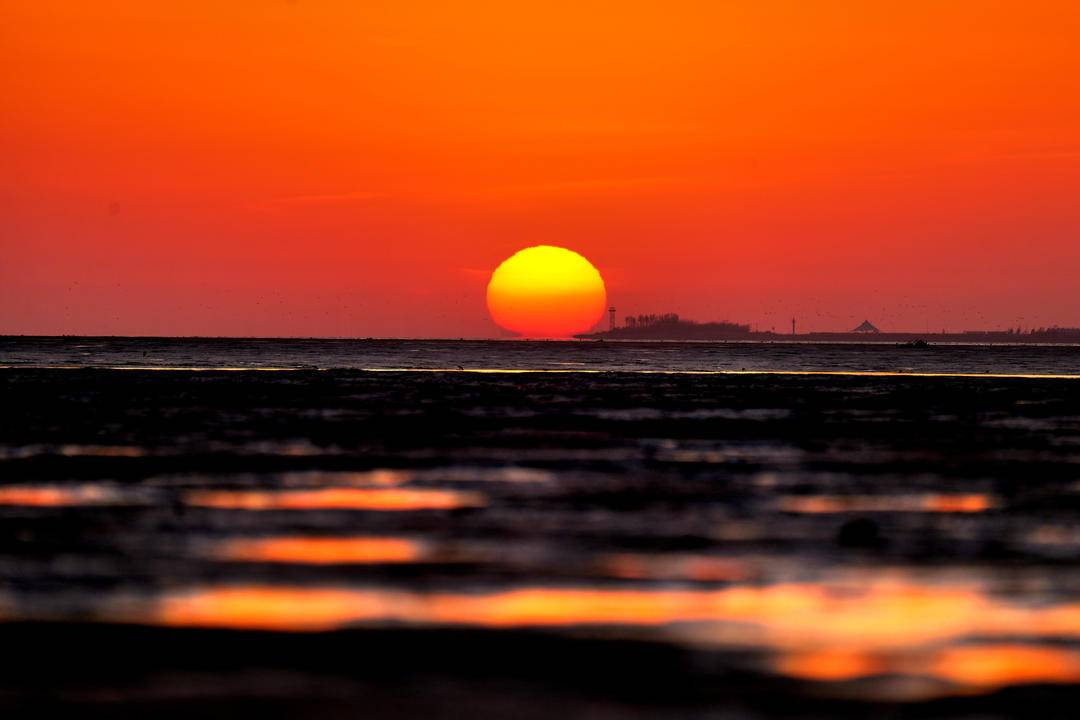 С наступлением сумерек красное солнце медленно опускалось за горизонт на берегах Бохайского залива, окрашивая всю морскую акваторию в насыщенные оранжево-красные и золотисто-оранжевые оттенки.